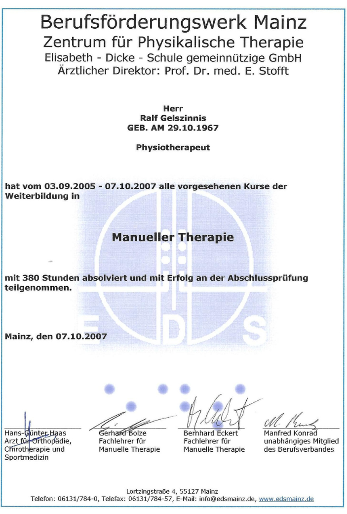 Ausbildung Manuelle Therapie mit erfolgreicher Abschlussprüfung
