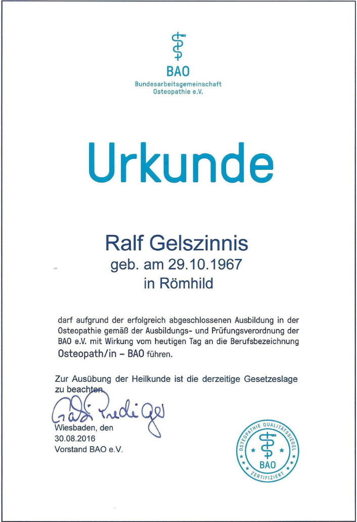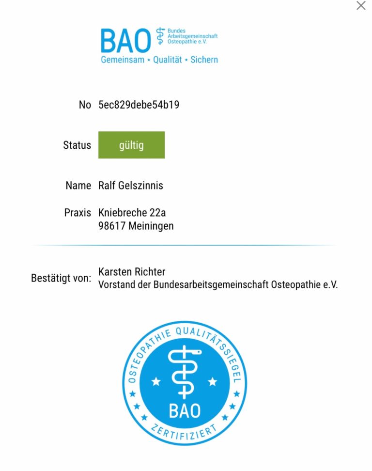 Zertifikat BAO zum Tragen der Berufsbezeichnung "Osteopath - BAO"