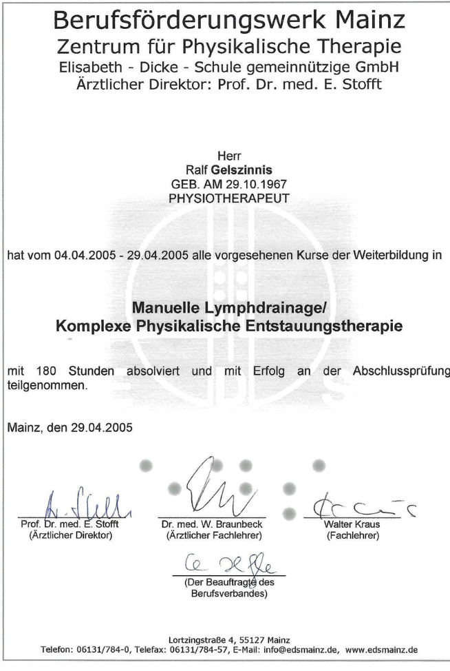 Ausbildung Manuelle Lymphdrainage mit erfolgreicher Abschlussprüfung