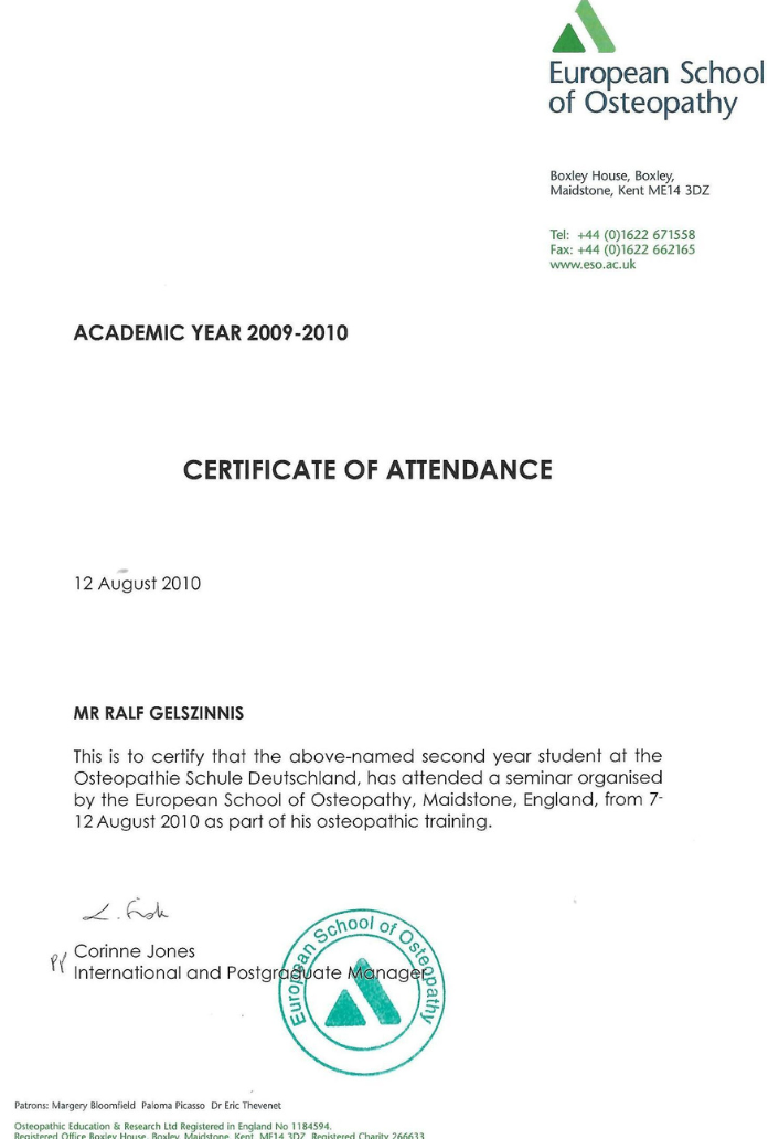 Zertifikat Auslandsaufenthalt an der European School of Osteopathy